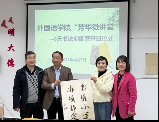 为扎实推进“三全育人”工作,提高学生审美素养和建立良好的道德情操,2023年4月7日17:30,外国语学院创办的“芳华微讲堂”第1期开班仪式在综合楼二楼党员活动室举办。学校党委委员、纪委书记李正旭,学院党委书记谭占海出席活动,训练营29名学员参加。开班仪式由学院党委副书记唐茜主持。
