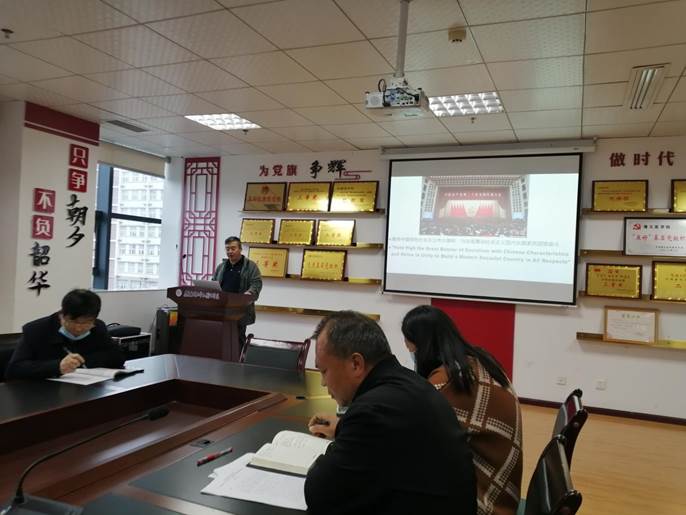 谭书记在党课中用英文解释了相关的报告内容,如“高举中国特色社会主义伟大旗帜,为全面建设社会主义现代化国家而团结奋斗”和“青年强,则国家强”等。同时,谭书记就报告中关于教育的提法倡导教师要在教学工作中向学生传播和灌输社会主义核心价值观,利用英语学科进行隐性思政教育,牢记教书育人的使命,不忘立德树人的初心,不断提高人文学科人才培养质量,真正做到为党育人、为国育才。