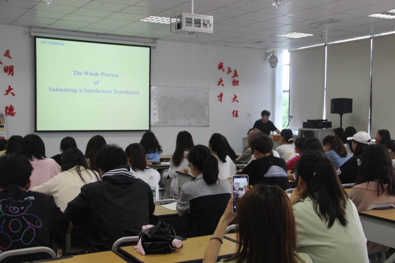 讲座开始,老师为大家简单地介绍了专业译者所需具备的素养及专业能力,就自身翻译经历谈到现今社会如何定义一份合格的译文,随后直接切入正题,以汉语经典文献《道德经》片段为例展示如何正确且符合源文本语义进行英语翻译,并以讲解外刊文章、翻译二级真题、外文报纸节选与老师本人翻译过的短文、诗歌等,使同学们更清楚地明白分析源文本的具体方法与步骤。最后他提到翻译过程中遇到困难与疑惑要及时与源文本作者沟通,翻译完成后也要进行自我审核、校对与改善。此次讲座,老师向大家展示出了翻译的特有魅力,同学们也有许多新的收获。