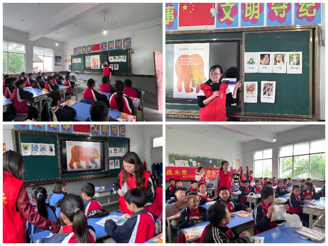 外国语学院党委书记谭占海同志对桑木小学的孩子们寄予了殷切期望:希望孩子们励志学习,走出桑木村,将来报效祖国,建设家乡。教工第三党支部的老师们为孩子们带来了科学实验套装等奖品,并以英文绘本 《Brown Bear, Brown Bear, what do you see》为主要教学内容,手工制作教具,带来了一堂趣味浓浓的英语课。在老师们的鼓励下,孩子们都热情的参与到课堂活动中来,整堂课在一片欢声笑语中结束。