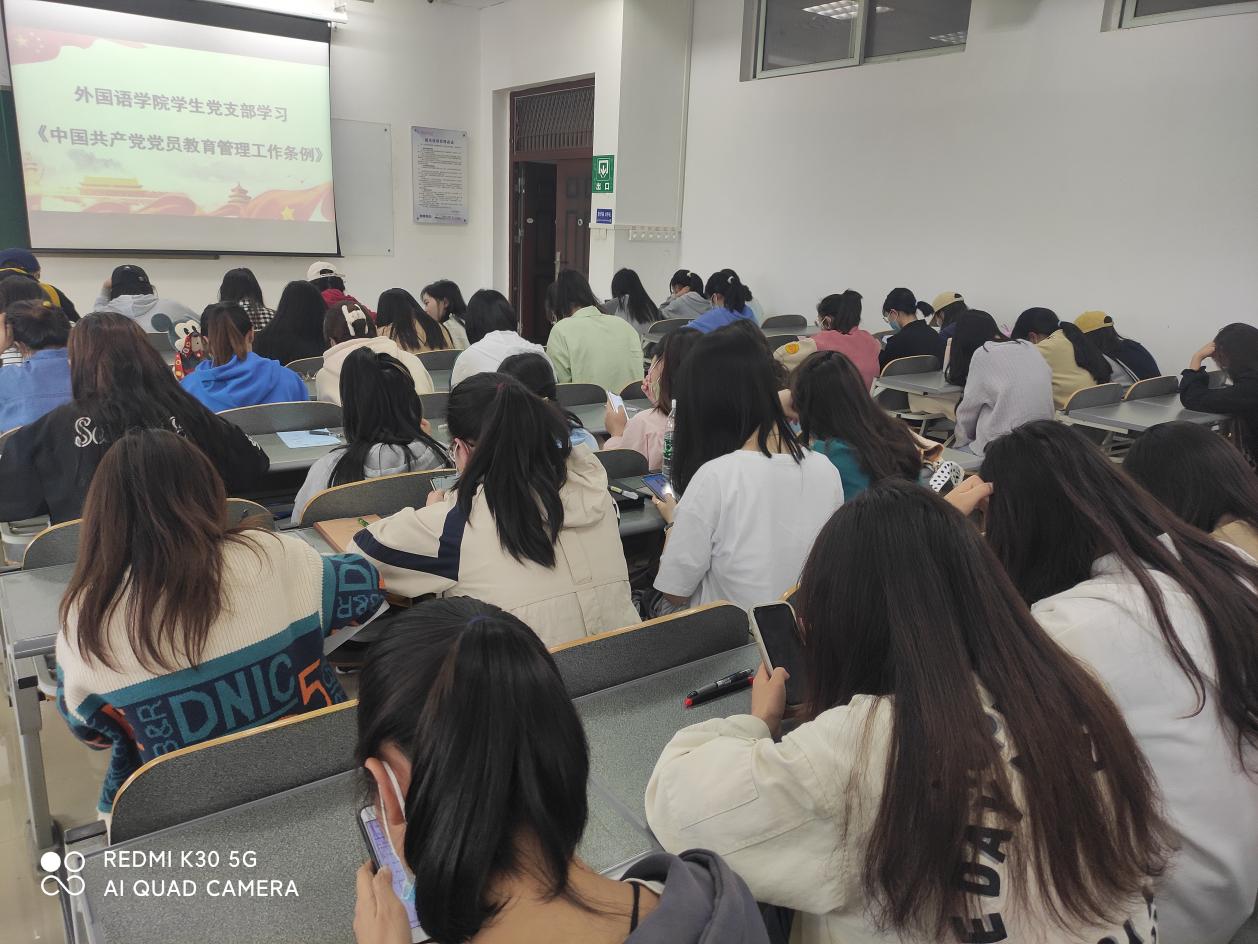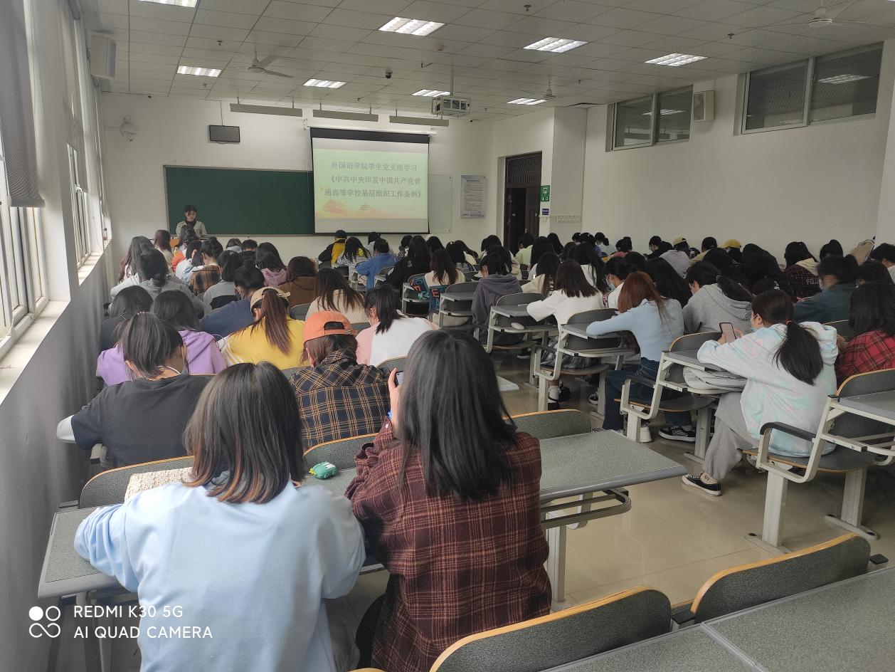 为深入学习贯彻党内法规条例,进一步提高学生党员的党纪党规意识和党性修养,2022年4月29日,外国语学院学生党支部在1号教学楼2—6A教室组织学习了《中国共产党普通高等学校基层组织工作条例》等党内法规条例。党支部近100名同志参加了学习,学习会由学生党支部书记杨芳主持。