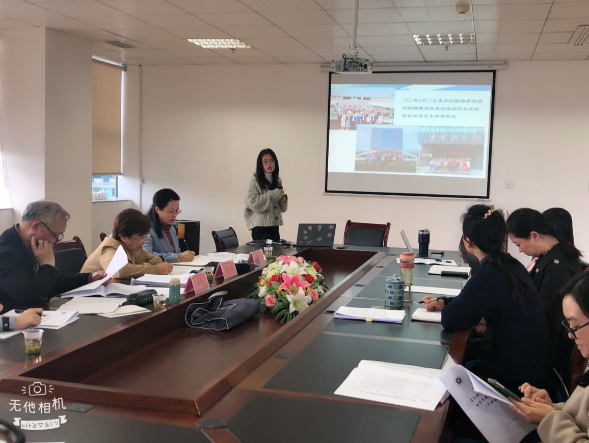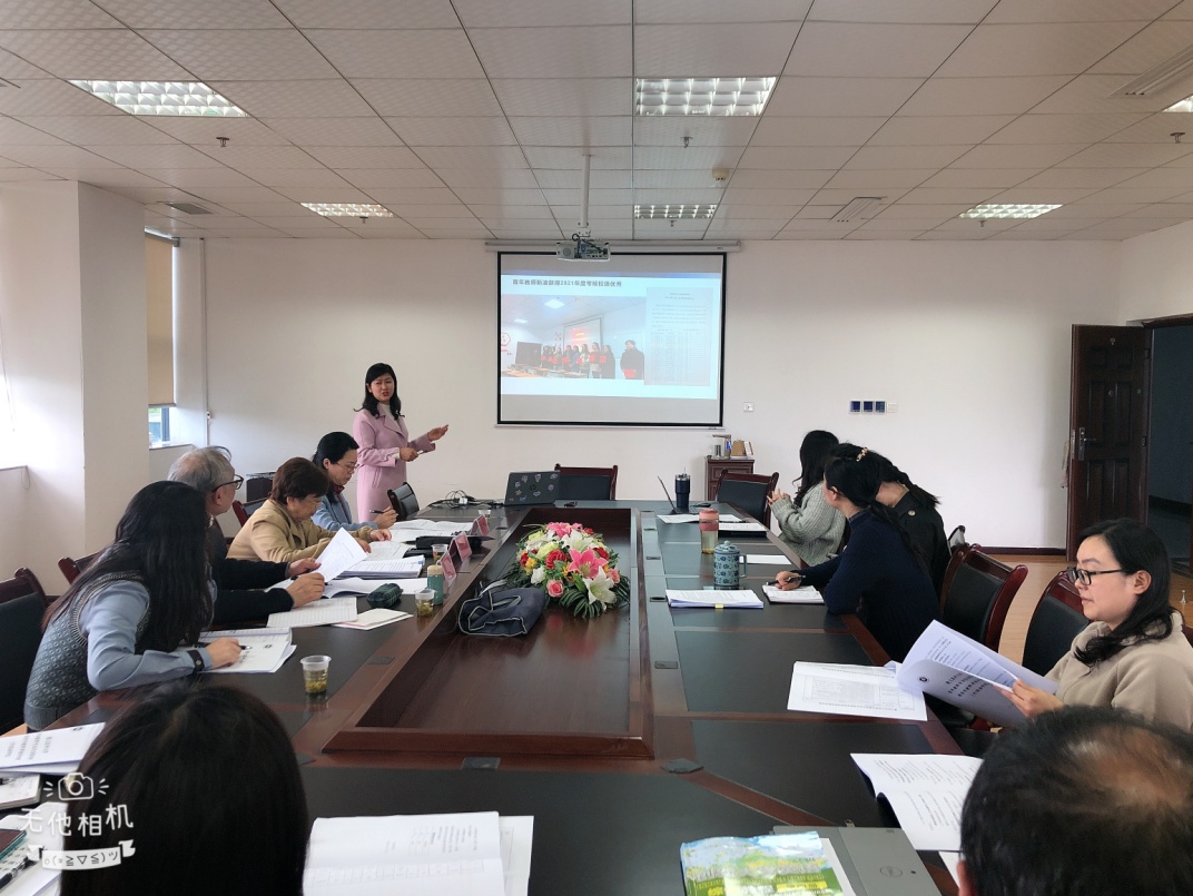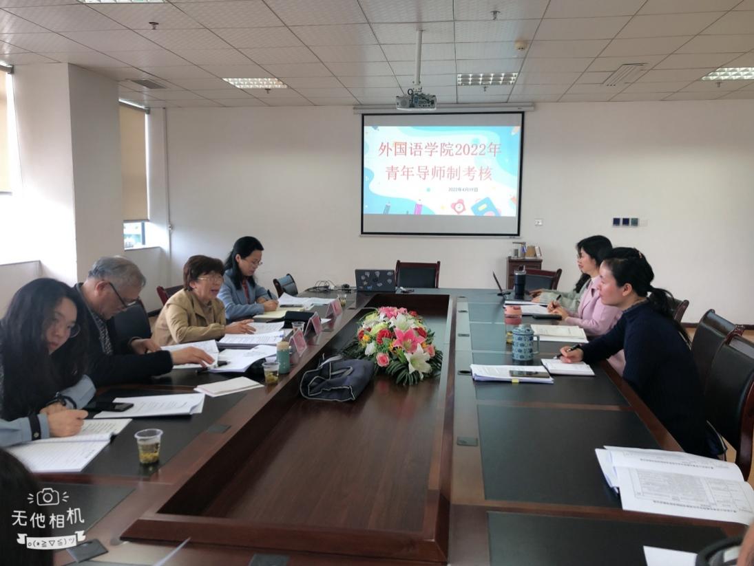 2022年4月19日下午14点30分,外国语学院和学校教师工作部联合对2021年入职的外国语学院的两名青年教师钟钰、靳凌以及两名指导教师王梅、金江琴进行青年教师导师制考核。参与这次考核的专家有来自学校督导组的钱民章教授、薛黔教授、教师工作部杨清玉部长,以及外国语学院考核小组成员等共计8名专家评审。
