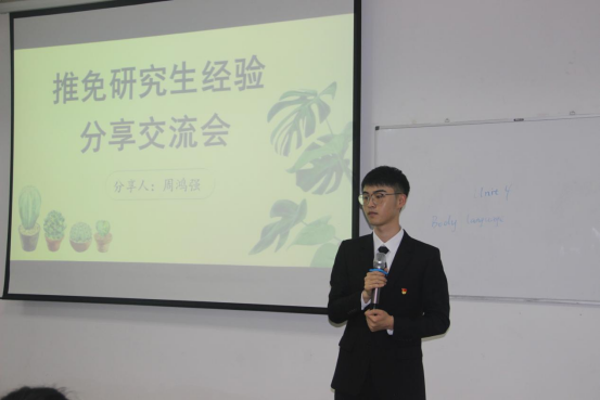 为帮助学生更好地了解研究生推免细节,做好个人学习和人生规划,明确发展方向。2023年5月9日15:40,外国语学院在综合实验楼二楼党员活动室开展推免研究生经验分享交流会,2022级全体学生参加。2019级英语专业周鸿强主讲,学生党支部书记杨芳主持。