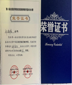 近日,由高等学校大学外语教学研究会、全国高等师范院校外语教学与研究协作组联合举办的第八届全国高等院校英语教师教学基本功大赛圆满落幕。我院英语语言文学教研室教师邹秀佶以省级一等奖的成绩进入决赛,并在决赛中荣获优秀课例评比·实录课组全国二等奖,其指导教师宋海蟾荣获优秀指导教师奖。