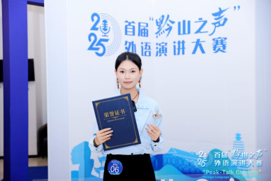 2025年4月11日,由贵州省外事办公室主办的首届"黔山之声"外语演讲大赛圆满落幕。我院2022级英语专业陈世操同学凭借优异表现在省内外500名选手中脱颖而出荣获高校组二等奖(第四名),并入选贵州省外语人才库。