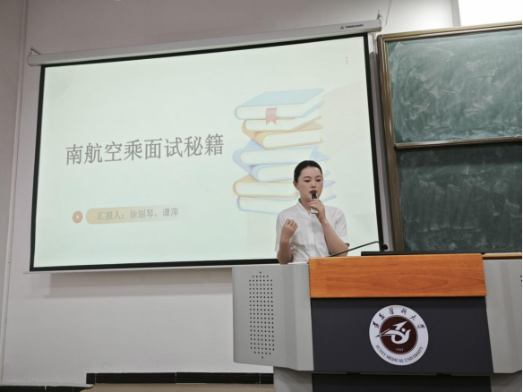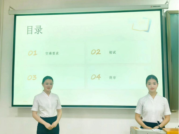 谭萍为大家讲解了南航空乘的基本要求、申请的必备材料,还详细介绍了面试过程中形体展示和礼仪要求;在自我介绍过程中要自信大方、全程微笑交流;并且强调遇到突发状况时一定要沉着冷静,保持良好的心态去面对问题。徐丽琴为大家就终审和体检过程的注意事项进行讲解,她根据自身面试经验分享了在终审情景模拟过程中的一些应对策略和技巧;并从体检要求、穿着、准备等方面为大家讲解。