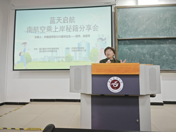 为拓展学生职业发展视野,提升就业竞争力,为同学们提供更多的就业选择。2025年4月24日下午16:00,由外国语学院团委和外国语学院关工委承办的"蓝天启航,南航空乘上岸秘籍"分享会在第三教学楼第二十九阶教室举办。活动由学院党委副书记唐茜主持,特邀遵义医科大学关工委副主任钱民章教授现场指导,2025届毕业生谭萍、徐丽琴主讲。学院团委负责人郑婉萍、博雅社区110余名学生参加。