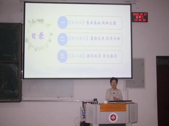 为深入贯彻落实教育强国战略,引导大学生明晰教育发展大势、增强使命担当。2025年5月27日19:00,学校党委委员、纪委书记,省监委驻遵义医科大学监察专员王明述在新蒲校区第二教学楼第6阶梯教室为英语22-1、英语22-2、心理22-1、心理22-2四个班级145名学生讲授了题为“从教育大国迈向教育强国”的形势政策课。