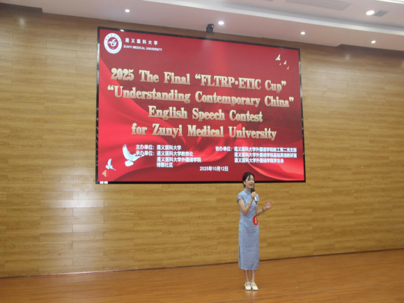 为提高大学生的思辨、表达和担当能力,传播中国好声音,2025年10月12日上午9:00,遵义医科大学举办了“外研社·国才杯”全国大学生外语能力大赛演讲决赛。该比赛属于教育部公布的全国大学生学科竞赛榜单中的B类赛事,含金量高,覆盖范围广泛。本次校赛由学校主办,教务处、外国语学院及博雅社区联合承办。很荣幸邀请到教务处副处长张继东教授开场致辞,由外国语学院党委书记谭占海教授、院长王梅教授等7位专家担任评委,另设两位提问评委,其中一名为外教Lisa。经过学校初赛的激烈角逐,共有21位选手脱颖而出,成功晋级此次校决赛。