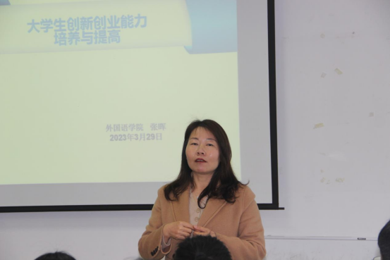 为培养大学生创新创业的能力,提高大学生自主创新意识,2023年3月29日15:50,外国语学院在综合楼专业五教室举办以大学生创新创业能力的培养和提高为主题的讲座。外国语学院张晖老师担任主讲人,2022级英语B班全体同学参加本次讲座。
