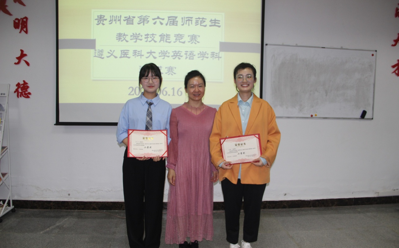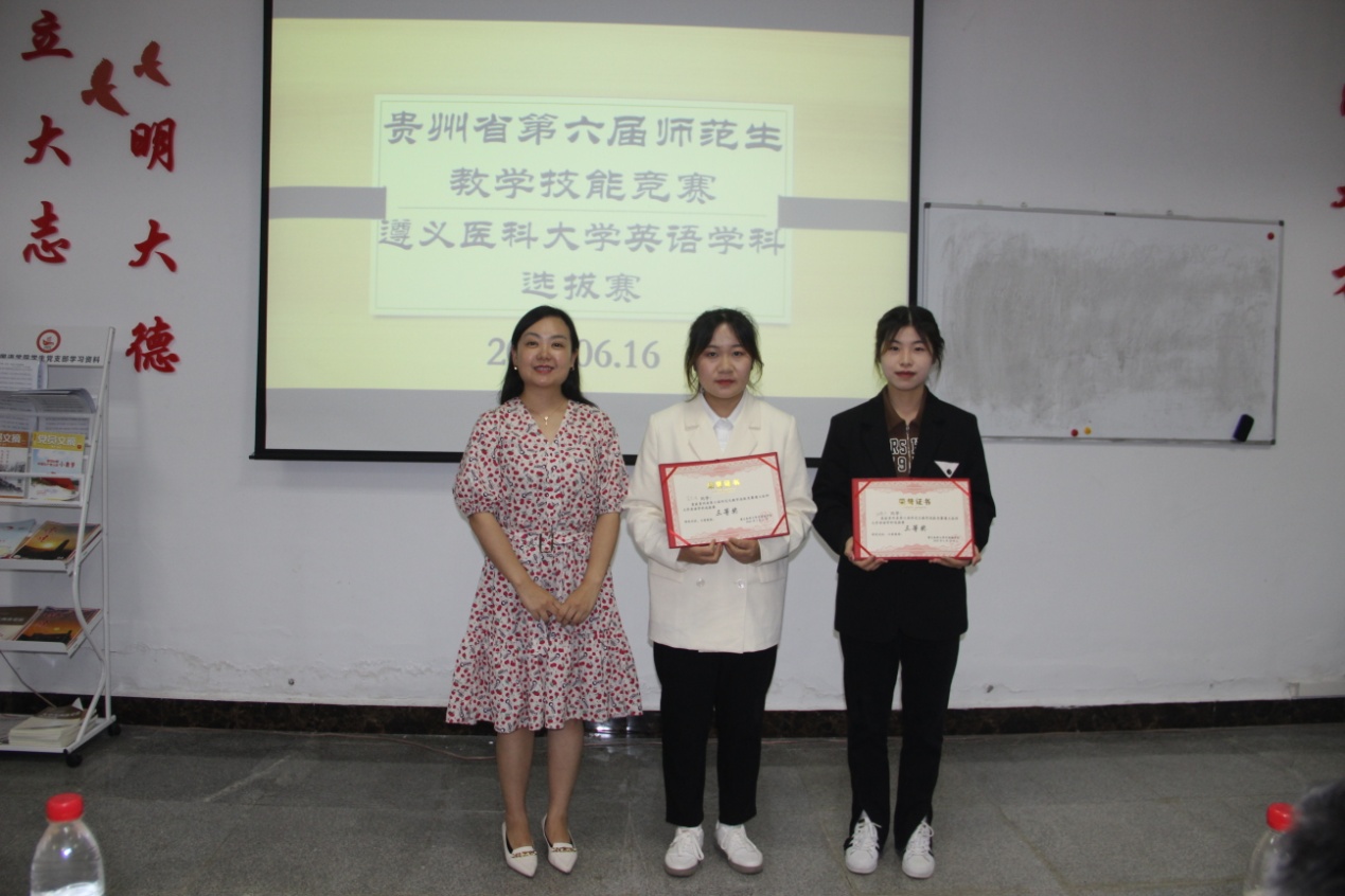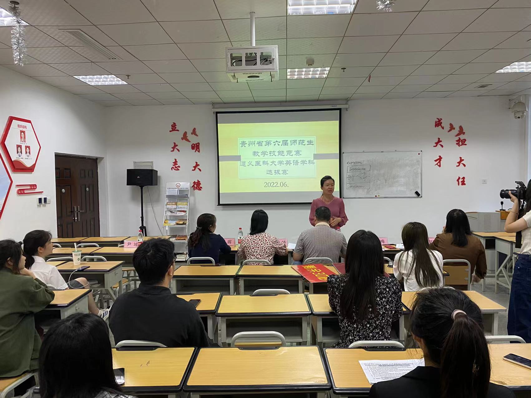 6月16日下午,贵州省第六届师范生教学技能竞赛遵义医科大学英语学科选拔赛在综合实验楼二楼外国语学院专业五教室举行。本次竞赛旨在进一步提高我校英语专业学生的教学技能水平及选拔优秀选手代表我校参加省级教学技能竞赛。院党委书记谭占海教授、院长王梅教授、听说教研室王厚红副教授、商务英语教研室张晖副教授和综合英语教研室何永娇副教授出席本次竞赛并担任竞赛评委。