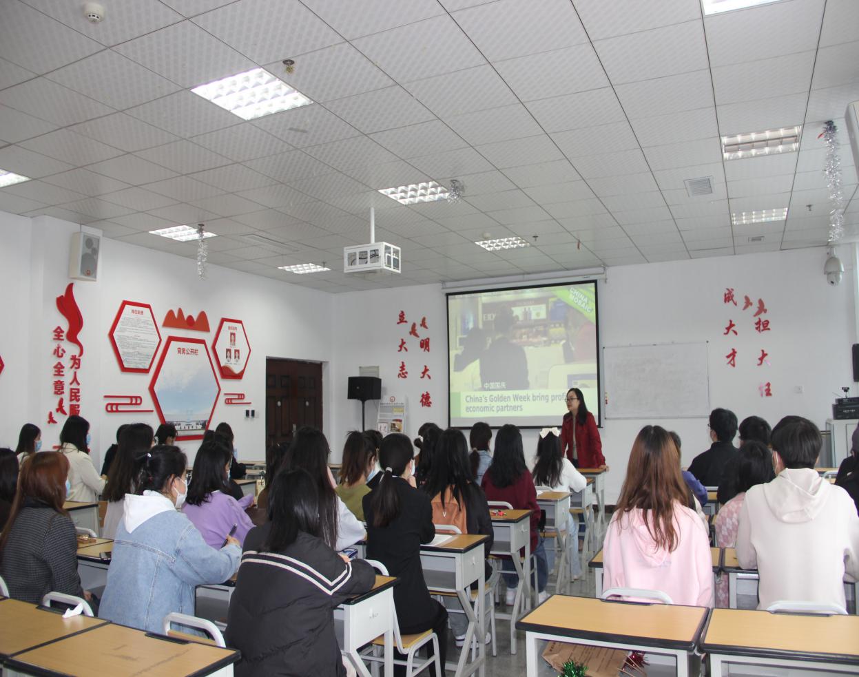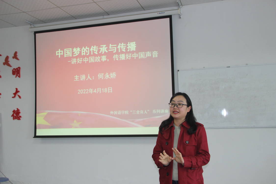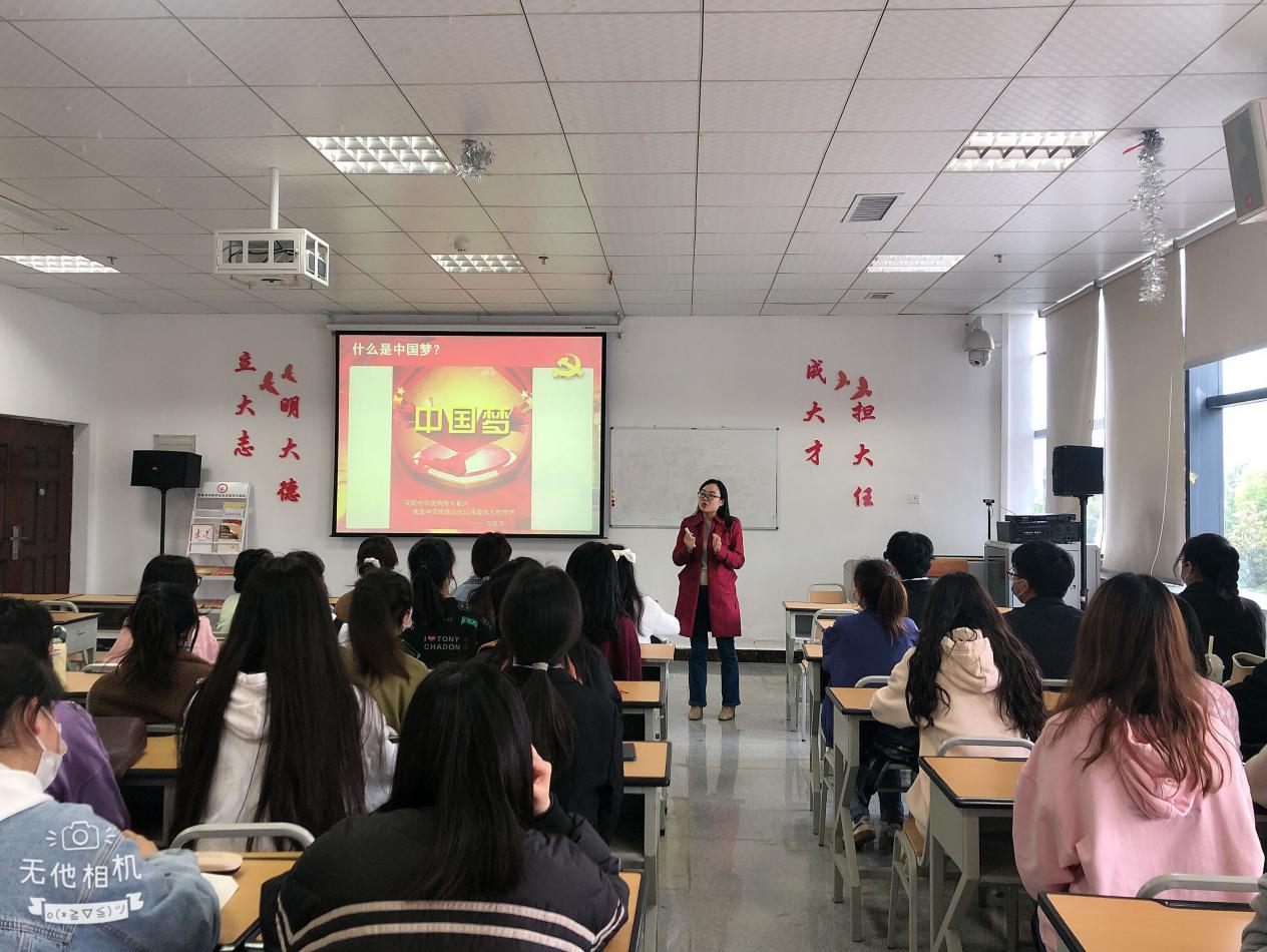 传承东方典藏,智育华夏儿女。为了进一步增强大学生为实现中国梦而不断奋斗的意识,4月18日15点40分,外国语学院在专业五教室开展“中国梦的传承与传播”主题讲座,讲座由外国语学院第二教工党支部书记何永娇主讲,2020级英语专业、商务英语专业全体同学到场聆听。