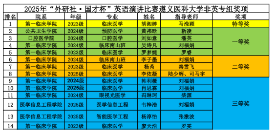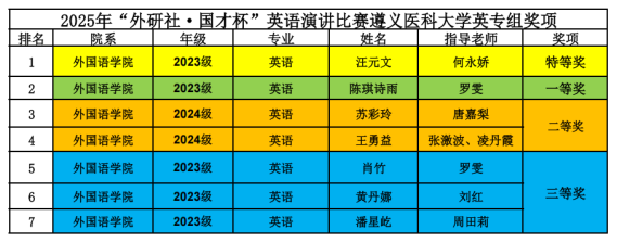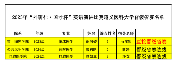 赛事以“Strike the Waves”为主题,21位晋级选手围绕主题展开精彩演讲。比赛设置定题演讲、评委提问和即兴演讲环节,全面展现选手的语言功底与思辨能力。中场穿插互动抽奖与歌曲表演,增添了赛事色彩。赛后,王梅院长倾情点评,肯定了选手们的表现,也给出了专业的指导意见。赛后公布获奖名单,最终评选出特等奖2名、一等奖5名、二等奖5名及三等奖9名。第一名直接晋级省赛,第二名和第三名晋级省赛选拔。经贵州省竞赛组委会审核选拔,口腔医学院的刘如意同学也成功晋级省级演讲决赛。