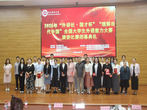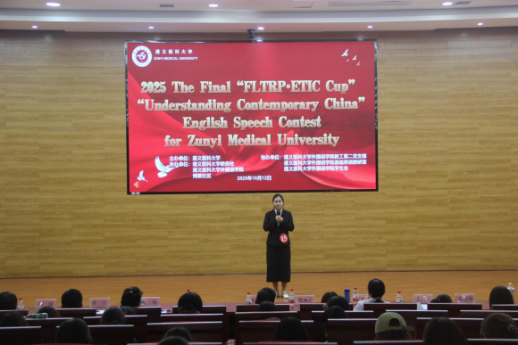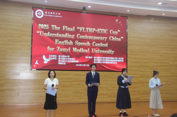 为提高大学生的思辨、表达和担当能力,传播中国好声音,2025年10月12日上午9:00,遵义医科大学举办了“外研社·国才杯”全国大学生外语能力大赛演讲决赛。该比赛属于教育部公布的全国大学生学科竞赛榜单中的B类赛事,含金量高,覆盖范围广泛。本次校赛由学校主办,教务处、外国语学院及博雅社区联合承办。很荣幸邀请到教务处副处长张继东教授开场致辞,由外国语学院党委书记谭占海教授、院长王梅教授等7位专家担任评委,另设两位提问评委,其中一名为外教Lisa。经过学校初赛的激烈角逐,共有21位选手脱颖而出,成功晋级此次校决赛。