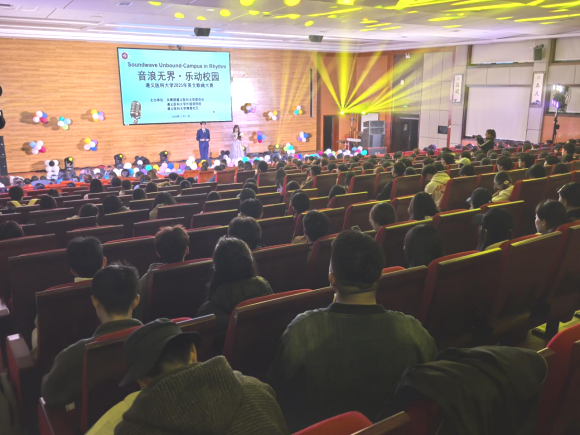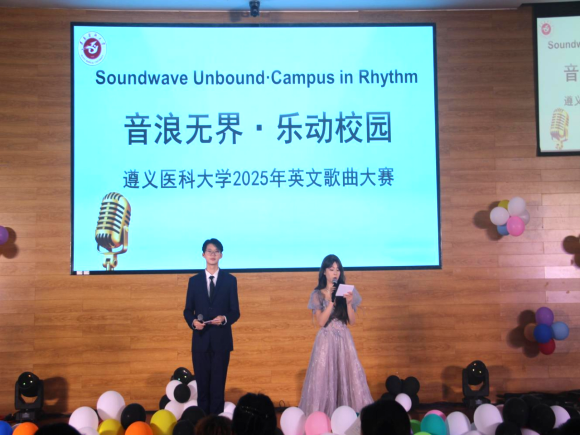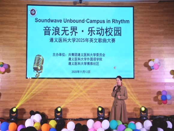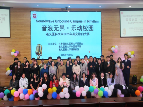 为创新英语学习形式、营造沉浸式学习氛围,激发学生英语学习兴趣与表达热情,2025年11月12日晚,由学校团委、博雅社区与外国语学院、学院关工委联合主办的遵义医科大学2025年“音浪无界·乐动校园”英文歌曲大赛决赛在道德讲堂精彩上演。遵义师范学院音乐与舞蹈学院副教授夏颜、遵义职业技术学院李国鸿,学校外国语学院院长王梅、学校党委统战部副部长李菲、外国语学院综合英语教研室主任何永娇、外籍教师Hannah、Lisa担任评委,以专业视角为赛事把关。来自全校各学院的19支代表队同台竞技,用歌声展现英语魅力与青春风采。