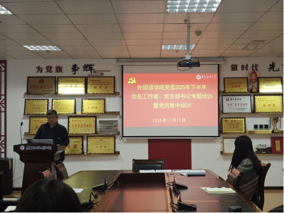 为强化党务队伍履职能力、筑牢党员思想根基,2025年11月17日至12月5日,外国语学院党委在综合实验楼414会议室组织开展了2025年下半年党务工作者、党支部书记专题培训暨党员集中培训,来自各党支部的党务工作者、支部书记及党员积极参与。