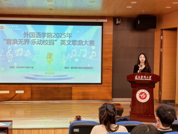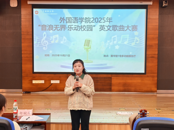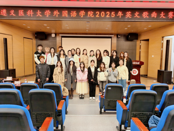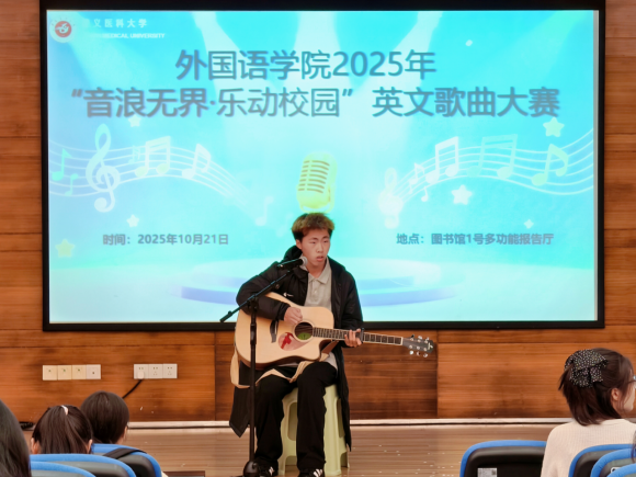 为丰富校园文化生活,激发学生英语学习热情,给同学们提供展现音乐才华的平台。2025年10月21日16:00,外国语学院于图书馆1号多功能报告厅成功举办了2025 年“音浪无界・悦动校园”英文歌曲大赛院赛。比赛邀请了遵义医科大学统战部副部长李菲、外国语学院党委副书记唐茜、学生处思政科科长,校音乐协会指导老师吴虞娱、外国语学院综合英语教研室副教授秦雪飞、外国语学院团委负责人郑婉萍担任此次比赛的评委,20支队伍参加比赛。