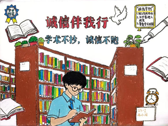 活动通过线上线下多渠道广泛宣传,让同学们全方位了解赛事详情,充分激发参与热情。创作者们紧扣“诚信”核心主题,将诚信理念与生活场景、时代元素深度融合,以鲜明的色彩搭配、新颖的构图设计、深刻的文字表达,生动诠释对诚信内涵的理解。作品中既有对诚信人物与经典故事的致敬,也有对失信行为的警示与反思,既展现了扎实的设计功底,更传递了当代大学生真挚的价值追求。比赛遵循“主题契合度、创意创新性、艺术表现力”三大评审维度,经过严格筛选,最终评选出一等奖1名、二等奖2名、三等奖3名及优秀奖10名。