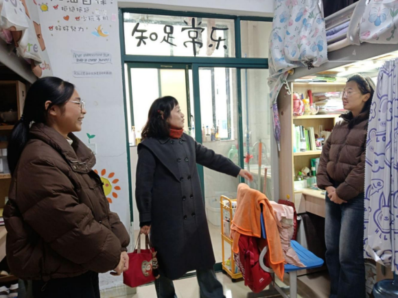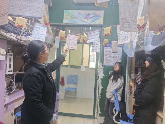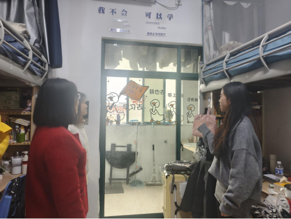 活动筹备阶段便收获同学们的热烈响应,各寝室成员群策群力、发挥创意,将寝室打造成兼具个性与内涵的专属空间。18日,党委副书记、专职辅导员、教师兼职班主任与学生会干部走进每间寝室,既感受到同学们用心营造的温馨氛围,也细致核查了卫生状况与用电安全。有的寝室贴满室友的学习生活照片与各类获奖证书、过级证书,定格成长瞬间、彰显奋进风采;有的精心设置阅读角,整齐摆放中外名著,书桌张贴励志话语与个人学习计划,让学习氛围浸润日常;还有的围绕二十届四中全会精神、“十四五”成就等时代主题布置手写双语金句,将家国情怀融入生活场景,展现当代青年的责任担当。多数寝室干净整洁、秩序井然,但个别寝室存在未使用电器仍插电、乱拉电线等安全隐患,带队老师当即提醒并指导同学们现场整改,筑牢校园安全防线。经过公平公正的评选,活动最终决出一等奖1名、二等奖2名、三等奖3名及优秀奖4名。