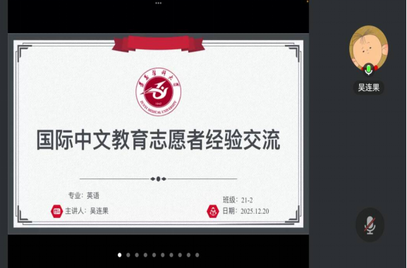 为拓展学生职业发展视野,进一步增进学生对国际中文教育志愿服务的了解,2025年12月23日14:30,外国语学院团委以腾讯会议形式为博雅社区学生开展了国际中文教育志愿者线上工作经验分享会。本次分享会邀请到国际中文教育志愿者吴连果主讲,吴连果是外国语学院2025届毕业生,于今年8月赴柬埔寨从事中文教学志愿服务工作。分享会由学院党委副书记唐茜主持,学院团委负责人郑婉萍、2022级全体学生及2023级部分学生参与。