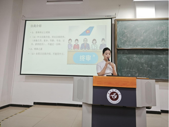 谭萍为大家讲解了南航空乘的基本要求、申请的必备材料,还详细介绍了面试过程中形体展示和礼仪要求;在自我介绍过程中要自信大方、全程微笑交流;并且强调遇到突发状况时一定要沉着冷静,保持良好的心态去面对问题。徐丽琴为大家就终审和体检过程的注意事项进行讲解,她根据自身面试经验分享了在终审情景模拟过程中的一些应对策略和技巧;并从体检要求、穿着、准备等方面为大家讲解。